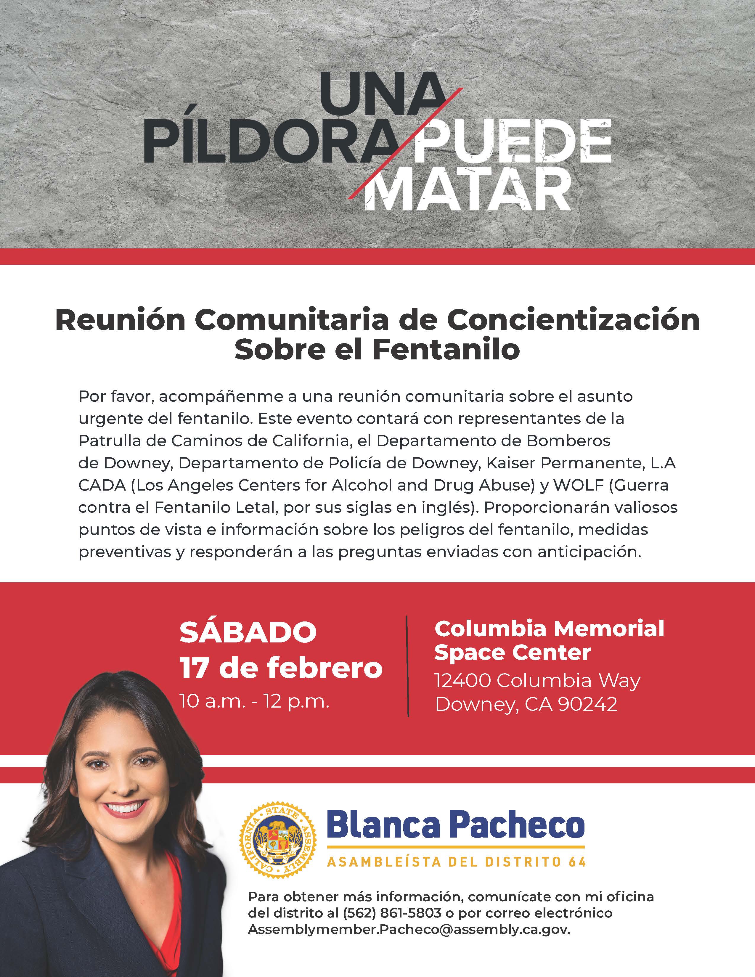 Únase a nosotros para un importante encuentro comunitario sobre la concienciación del fentanilo, organizado por la Asambleísta Blanca Pacheco del Distrito 64. Este evento crítico contará con la participación de representantes de la Patrulla de Caminos de California, el Departamento de Bomberos de Downey, el Departamento de Policía de Downey, Kaiser Permanente, L.A. CADA y WOLF. Compartirán información vital sobre los peligros del fentanilo, estrategias de prevención y responderán a preguntas previamente enviadas. ¡No pierda esta oportunidad de aprender e involucrarse en este tema urgente!