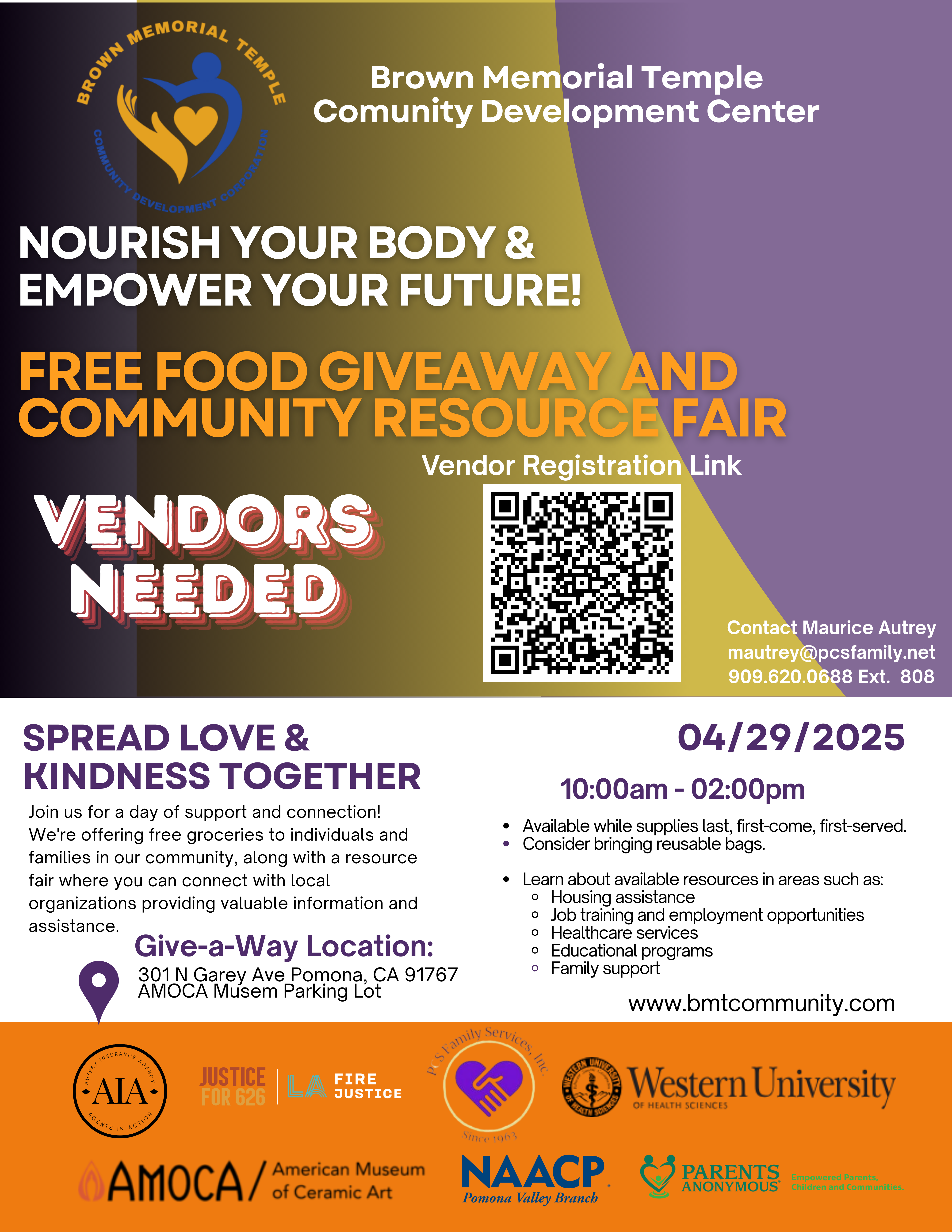 Join the Brown Memorial Temple Community Development Center for a day of support and connection! This event offers free groceries (while supplies last) and a resource fair featuring information on housing assistance, job training, healthcare services, educational programs, and family support.