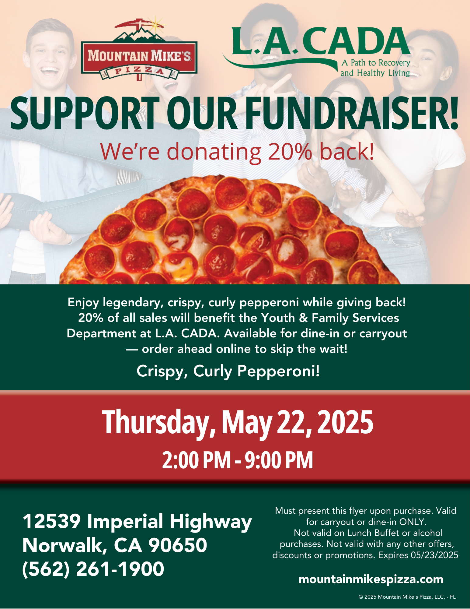 Join us at Mountain Mike’s Pizza for a delicious way to make a difference! Enjoy their legendary crispy, curly pepperoni and help support L.A. CADA’s Youth & Family Services Department—20% of all sales will be donated back to our programs.