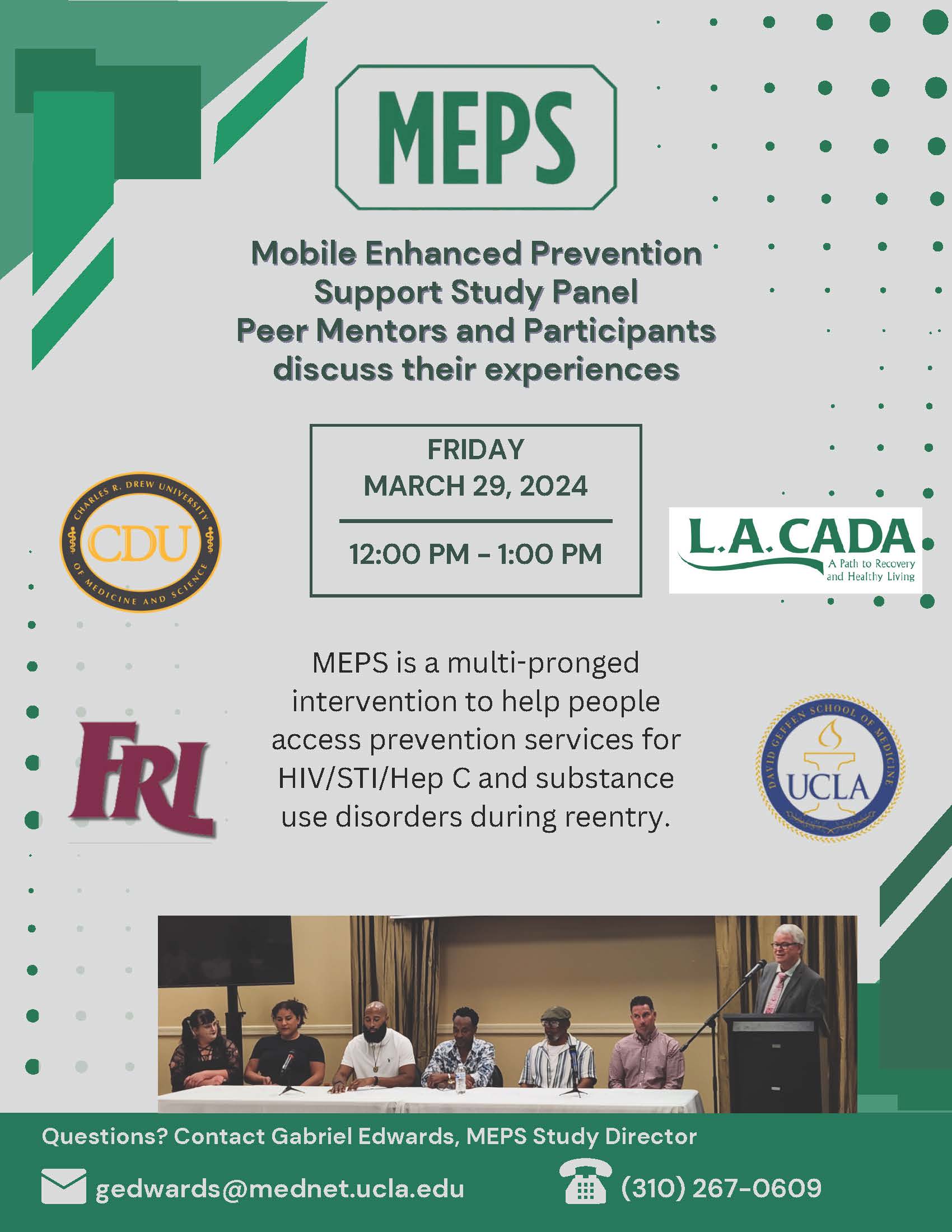 Join us for a lively discussion on the experiences of Peer Mentors and Participants in the Mobile Enhanced Prevention Support Study Panel. The event will take place on Friday, March 29, 2024, from 12:00 PM to 1:00 PM. For further details and registration, please reach out to Gabrield Edwards, MEPS Study Director, at (310) 267-0609 or via email at gedwards@mednet.ucla.edu. We look forward to your participation!