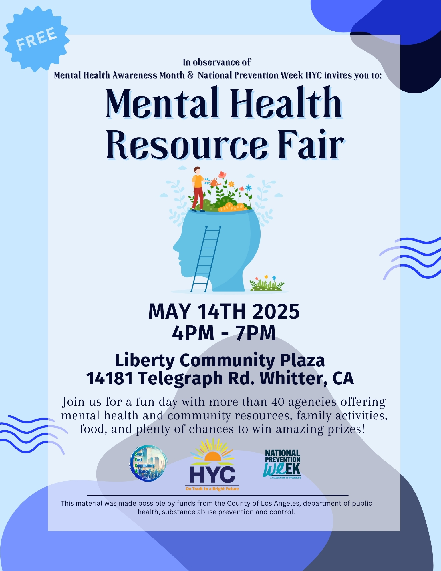 L.A. CADA's Youth Department is excited to participate in HYC's Annual Mental Health Resource Fair! This is a fantastic opportunity to connect with the community, share valuable resources, and promote mental wellness in a fun and engaging environment. This resource fair is part of Mental Health & Prevention Week, which will also feature wellness workshops throughout the week of May 12th-16th to support and empower our community.