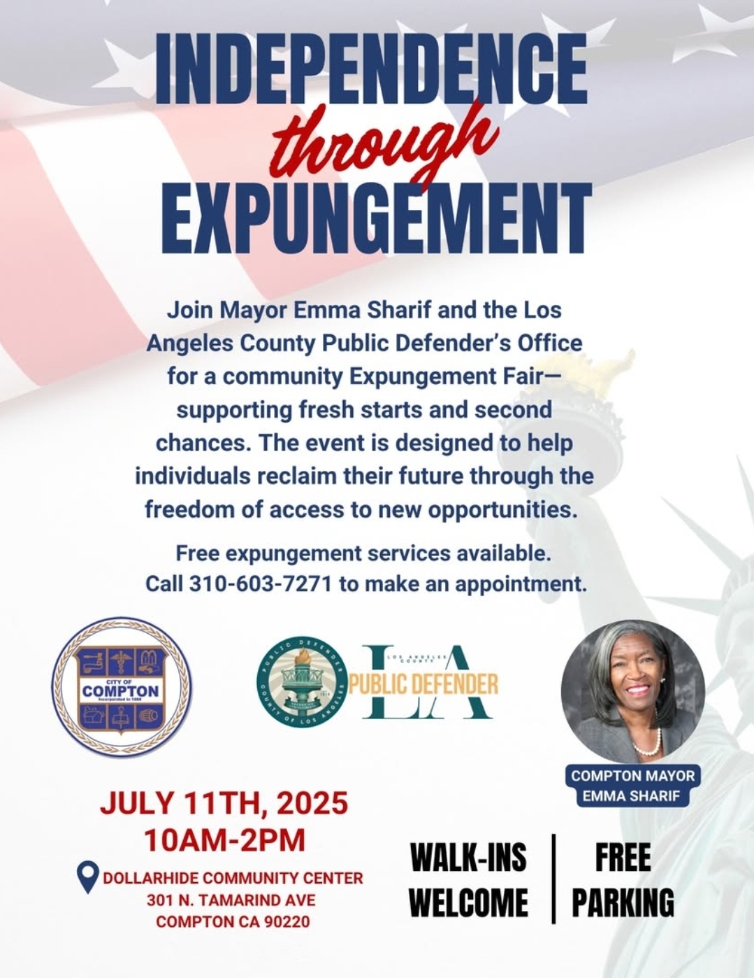 Join Mayor Emma Sharif and the Los Angeles County Public Defender’s Office for a community Expungement Fair, a chance to reclaim your future with free expungement services. This event is focused on supporting fresh starts and creating new opportunities for individuals seeking a second chance.