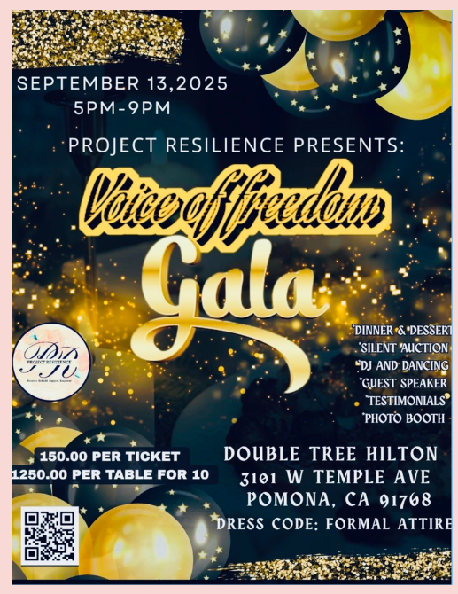 Project Resilience invites you to the "Voice of Freedom Gala," a formal evening dedicated to support, advocacy, and education. The event will feature dinner and dessert, a silent auction, testimonials, a guest speaker, and a photo booth.