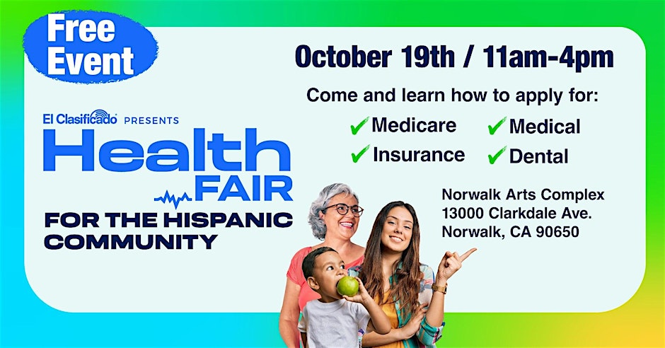 Join us for a free Health Fair hosted by El Clasificado on Sunday, October 19 at 11:00 AM at the Norwalk Arts & Sports Complex in Norwalk.