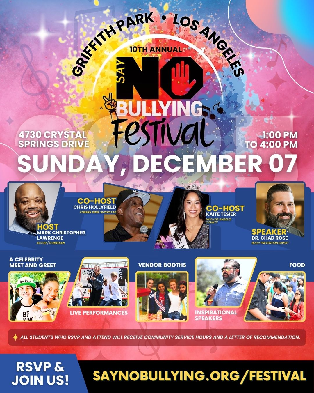 Join the community for an inspiring and fun-filled day at the 10th Annual Say No Bullying Festival. This event is dedicated to promoting kindness, inclusion, and a stand against bullying.