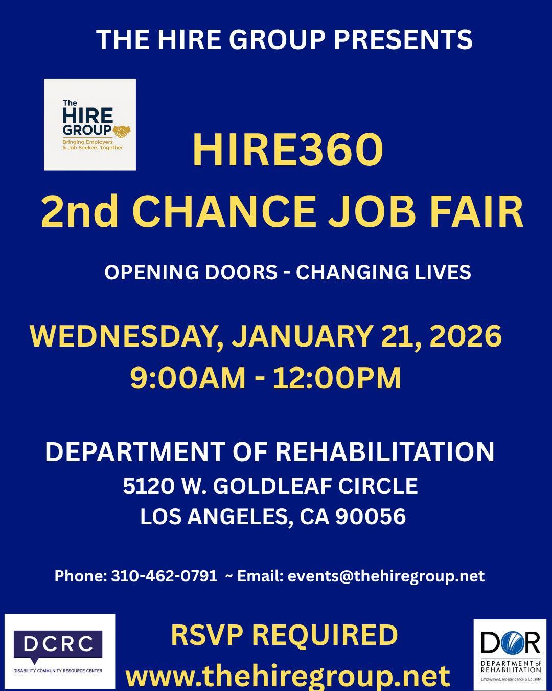 Description: The Hire Group presents the HIRE360 2nd Chance Job Fair, an event dedicated to "Opening Doors - Changing Lives." Hosted in partnership with the Department of Rehabilitation and the Disability Community Resource Center, this job fair is designed to bring employers and job seekers together.