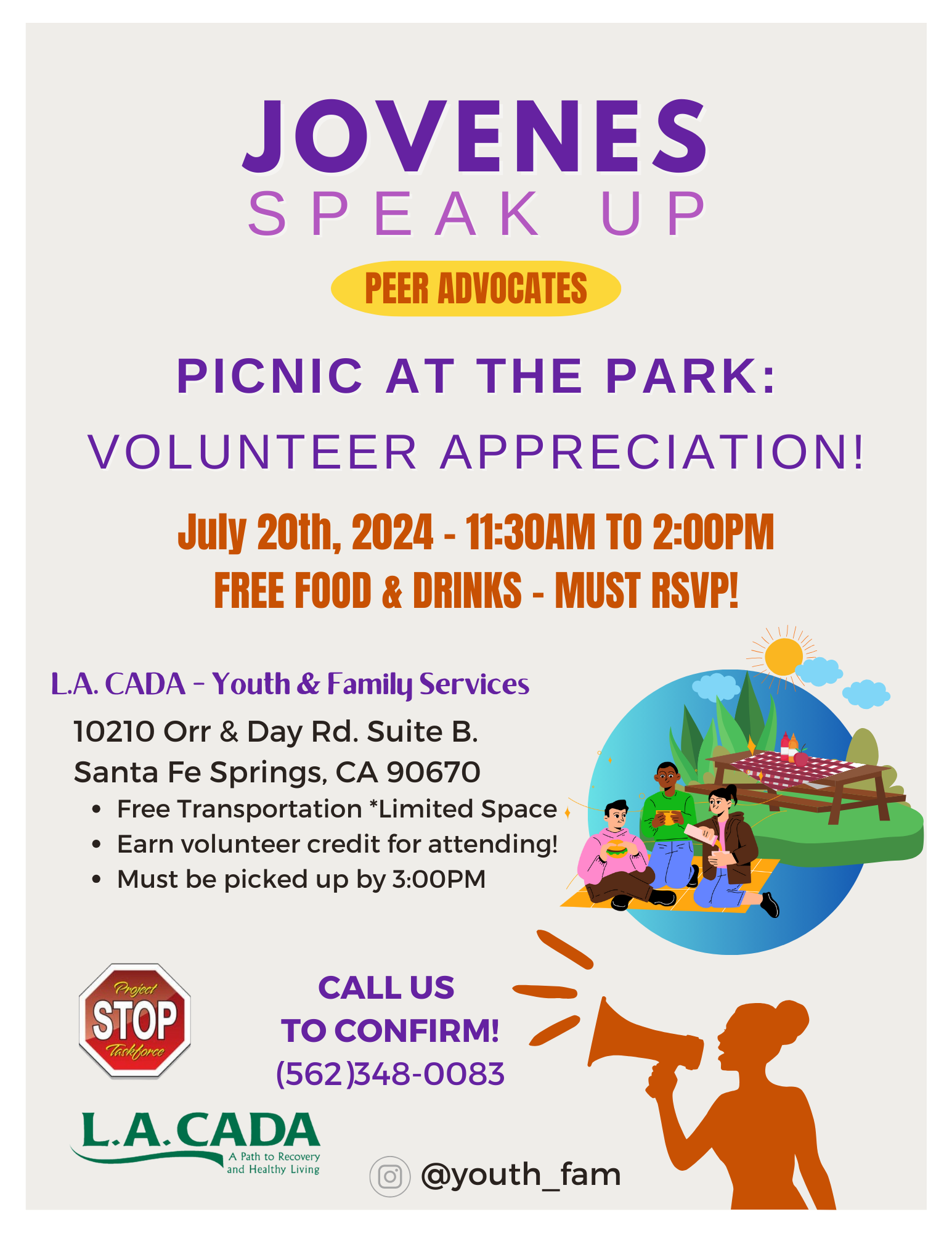 At JSU, you can develop valuable leadership skills by advocating for healthier lifestyles and fostering open discussions about addiction. The youth have the power to drive change. Become the voice for change and join us. For more information, please contact the Youth Department at (562) 348-0083.