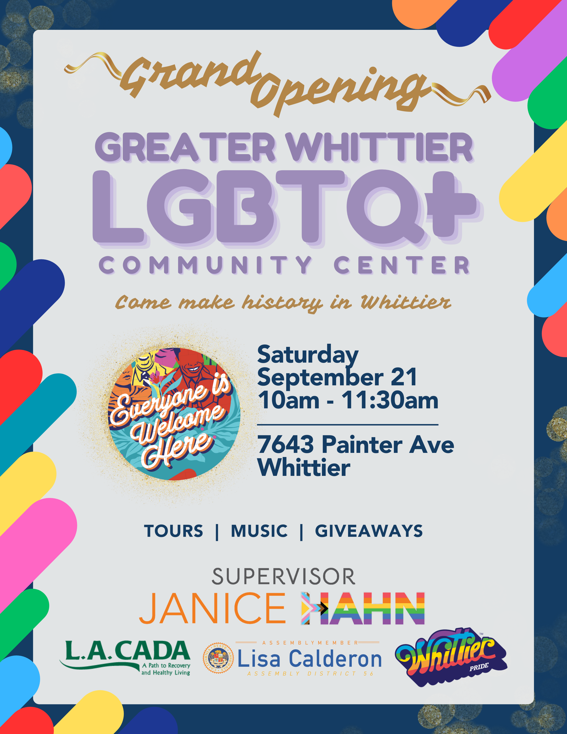 The Greater Whittier LGBTQ+ Community Center is hosting its Grand Opening on Saturday, September 21, from 10:00 AM to 11:30 AM at 7643 Painter Ave, Whittier. The event will feature tours, music, giveaways, and remarks by Supervisor Janice Hahn and Assemblymember Lisa Calderon. Everyone is welcome to come and make history in Whittier.
