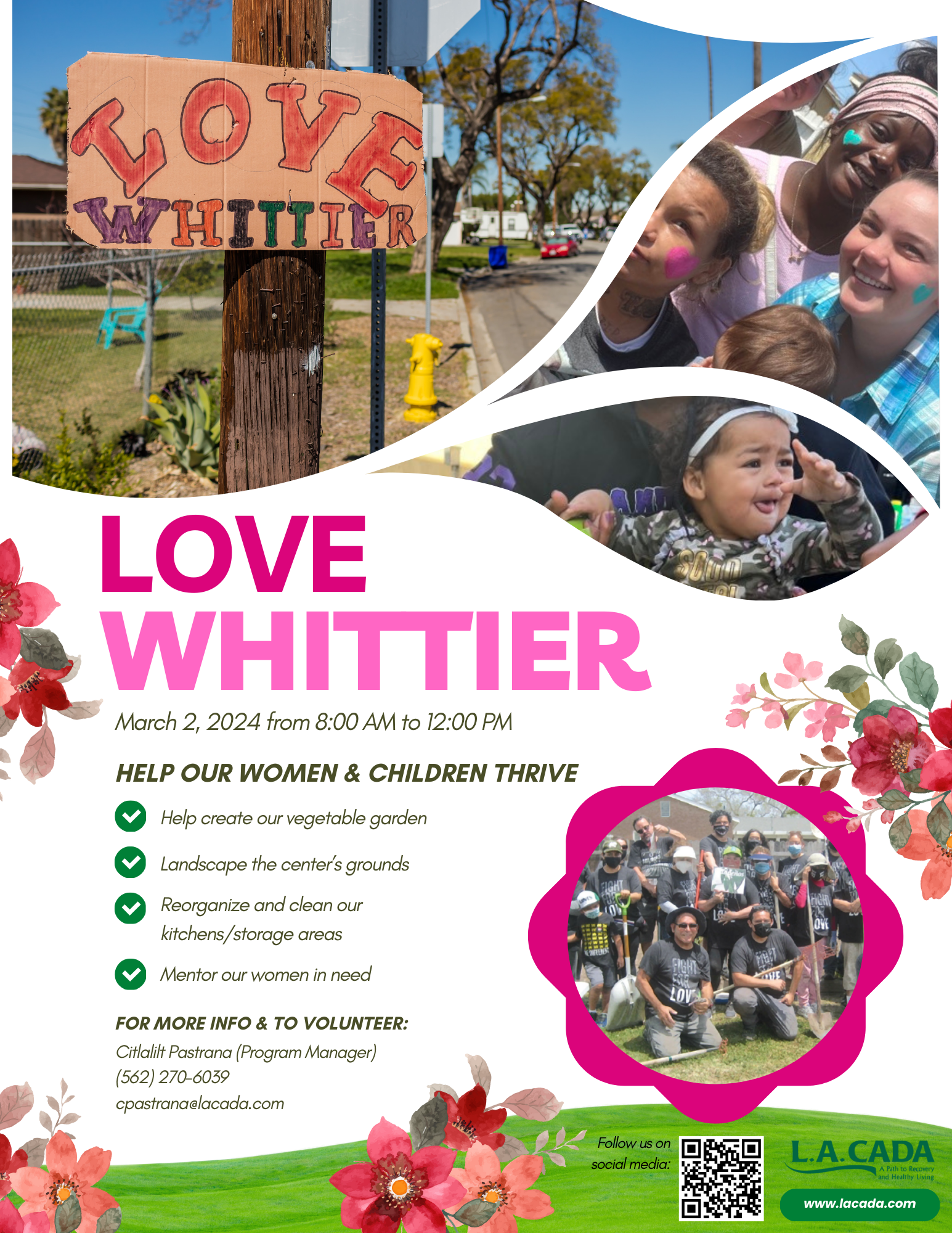 You are cordially invited to participate in the LOVE WHITTIER event, a meaningful community initiative scheduled for March 2, 2024, from 8:00 AM to 12:00 PM. This event is an opportunity for volunteers to come together and contribute to the enhancement and revitalization of spaces dedicated to supporting women and their children. The range of activities includes the beautification of a community garden, landscape improvements around the parking area, and the maintenance of trees and bushes. Additionally, efforts will be directed towards the reorganization and cleaning of various sheds and kitchens.