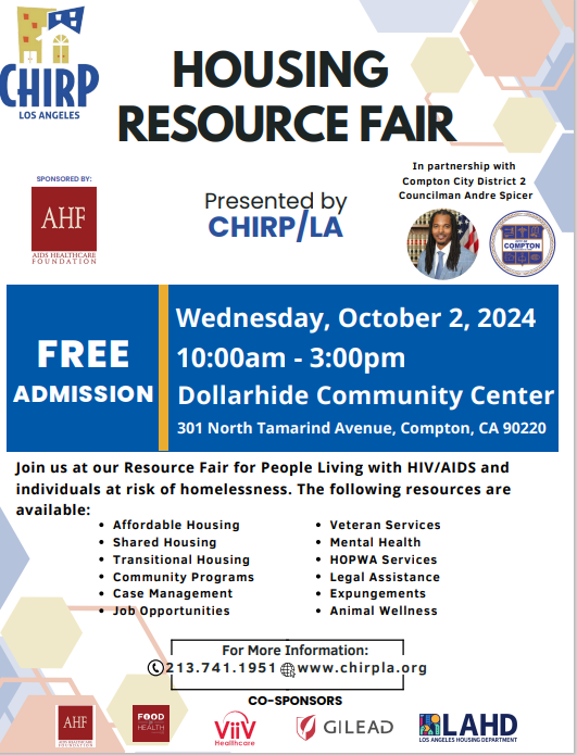 The Housing Resource Fair, presented by CHIRP/LA in partnership with Compton City District 2 Councilman Andre Spicer, will take place on Wednesday, October 2, 2024, from 10:00 AM to 3:00 PM at the Dollarhide Community Center in Compton. This event is designed to provide crucial resources for people living with HIV/AIDS and individuals at risk of homelessness. Attendees will have access to a range of services, including affordable housing, mental health support, legal assistance, veteran services, and more. Admission is free, and the event aims to connect the community with essential support systems and programs.