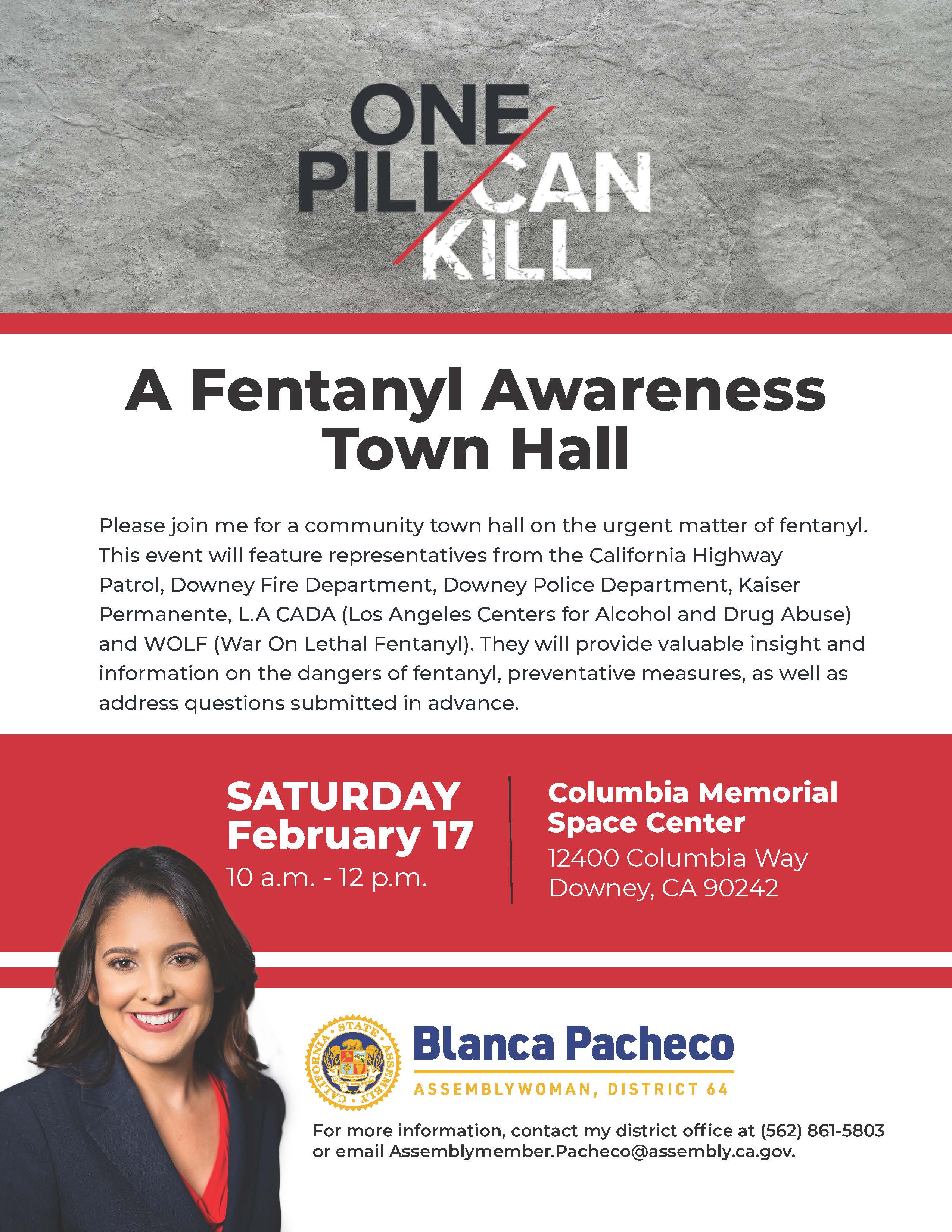 Join us for an important community town hall on fentanyl awareness, hosted by Assemblywoman Blanca Pacheco of District 64. This critical event features key speakers from the California Highway Patrol, Downey Fire Department, Downey Police Department, Kaiser Permanente, L.A. CADA, and WOLF. They will share vital information about the dangers of fentanyl, prevention strategies, and answer pre-submitted questions. Don’t miss this chance to learn and engage on this urgent issue!