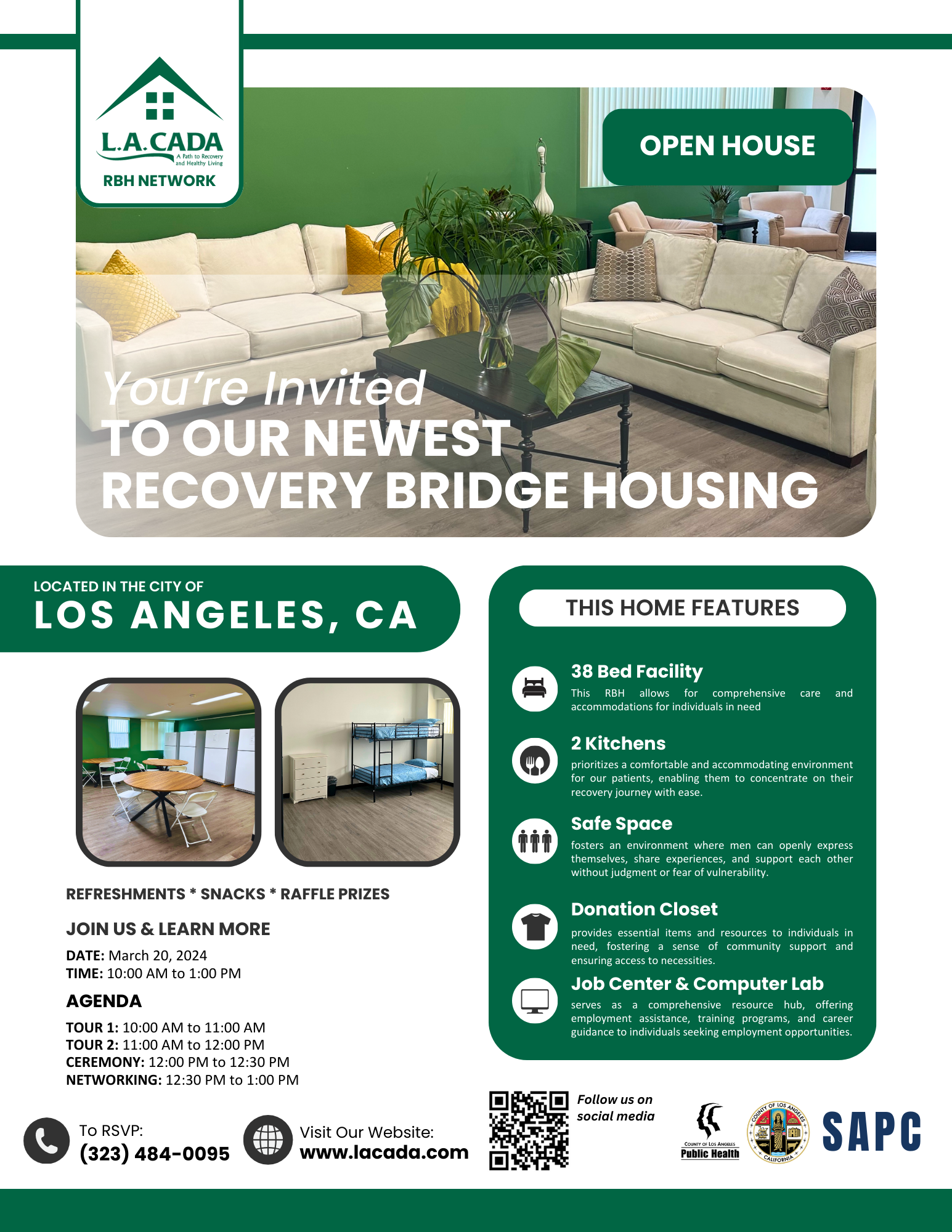 L.A. CADA would like to formally invite you to our open house of our newest Recovery Bridge Housing facility. This special event is scheduled for March 20, 2024, and to accommodate varying schedules, we're offering two tour times – one at 10:00 AM and another at 11:00 AM.