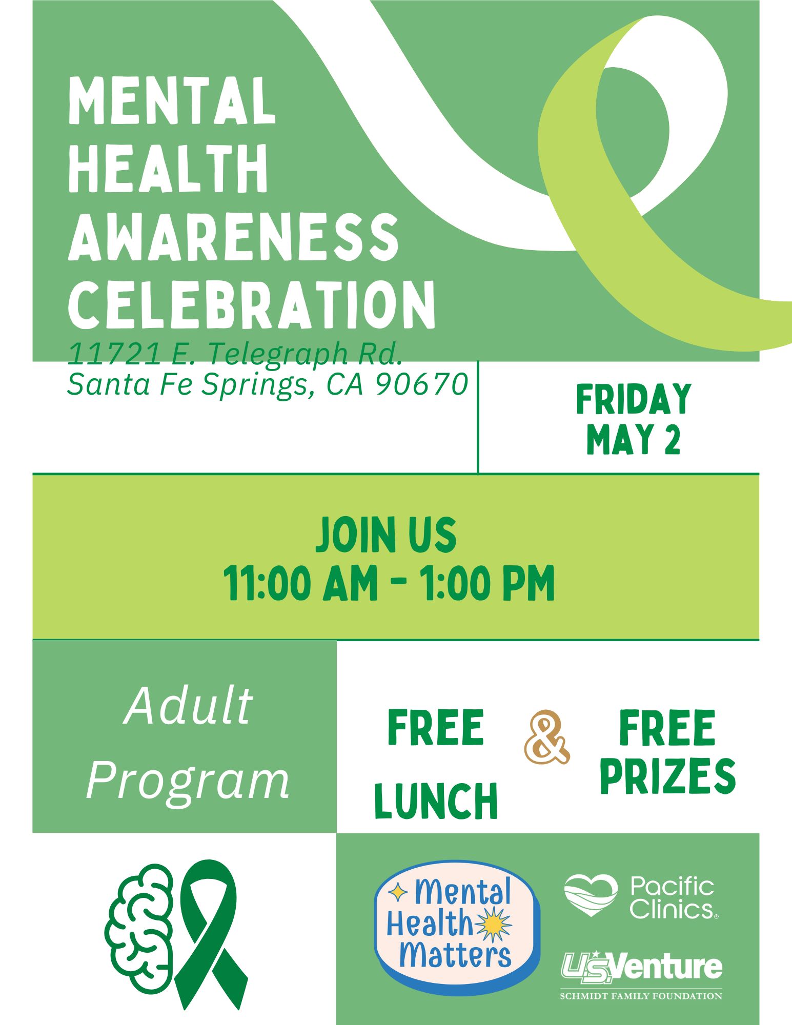 Join us for the Mental Health Awareness Celebration presented by Pacific Clinics! This special event will take place on Friday, May 2, from 11:00 AM to 1:00 PM, at 11721 E. Telegraph Rd., Santa Fe Springs, CA 90670. Enjoy a free lunch, exciting prizes, and engaging activities as we come together to promote mental health awareness. Don’t miss this opportunity to celebrate and support mental wellness in our community!