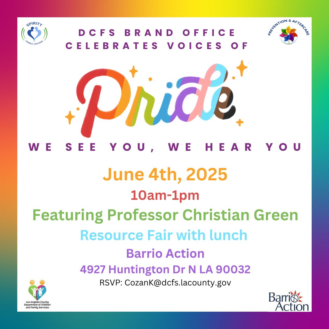Join us for the DCFS Brand Office's "Voices of Pride" Celebration on June 4th, 2025, from 10 AM to 1 PM at Barrio Action (4927 Huntington Dr N, Los Angeles, CA 90032). This inclusive event features a resource fair with lunch and a special presentation by Professor Christian Green. Together, let’s celebrate diversity, community, and the message "We See You, We Hear You." RSVP at CozanK@dcfs.lacounty.gov.