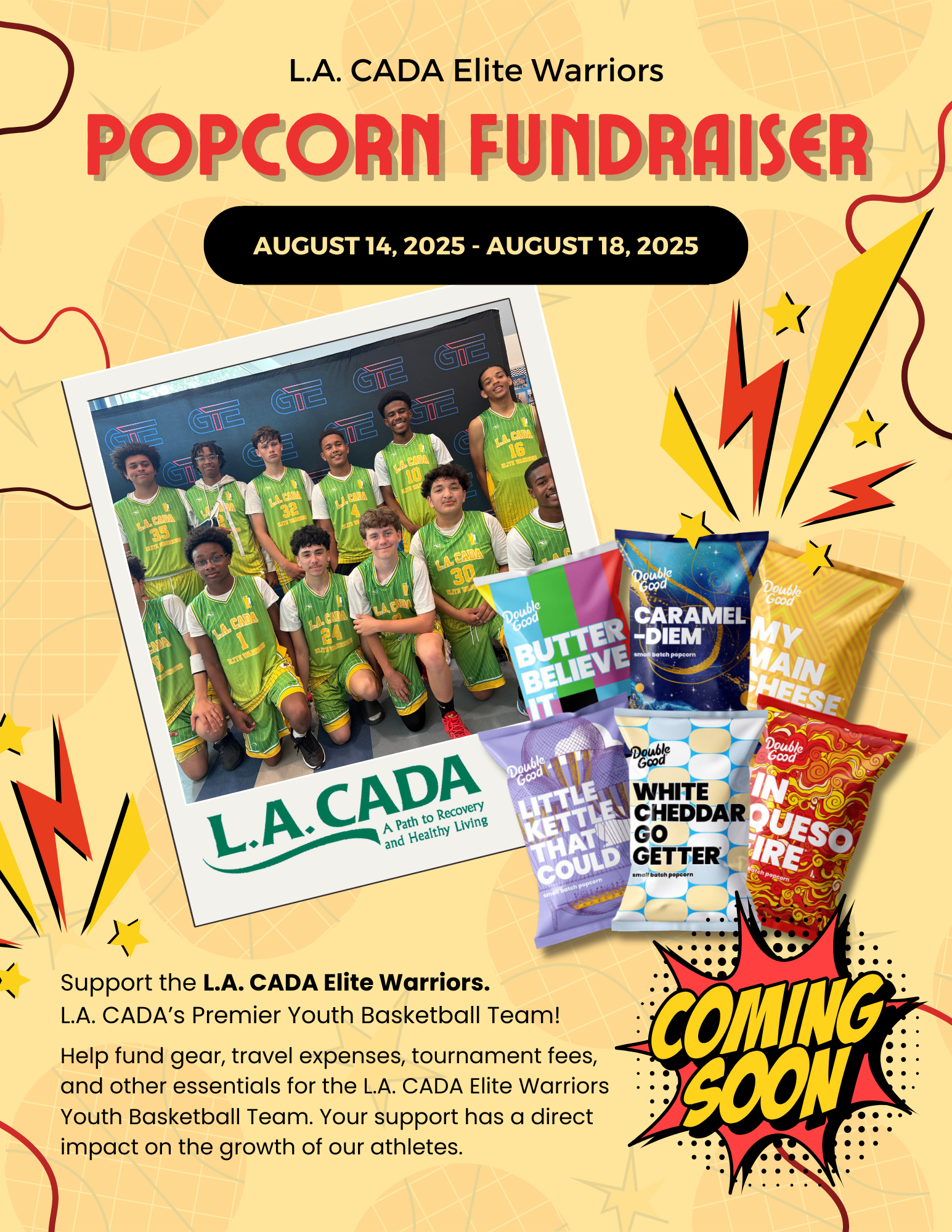 Support the L.A. CADA Elite Warriors, L.A. CADA’s premier youth basketball team, by participating in our upcoming Popcorn Fundraiser! Proceeds will help fund essential team needs such as gear, travel expenses, and tournament fees. Your contribution directly impacts the growth and success of our young athletes.
