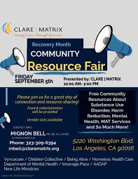 We’re excited to participate in the Recovery Month Community Resource Fair, hosted by CLARE | MATRIX! This event is a fantastic opportunity to connect with the community, share resources, and support individuals and families affected by substance use disorder and mental health challenges.