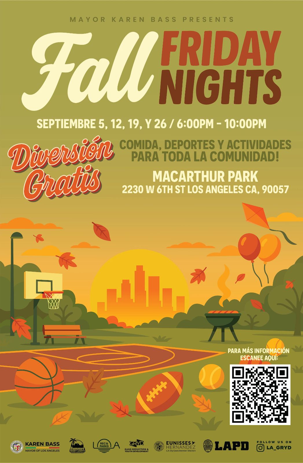Join the community for Fall Friday Nights, a free, family-friendly event presented by Mayor Karen Bass. Each Friday in September, MacArthur Park will host an evening of fun for everyone.