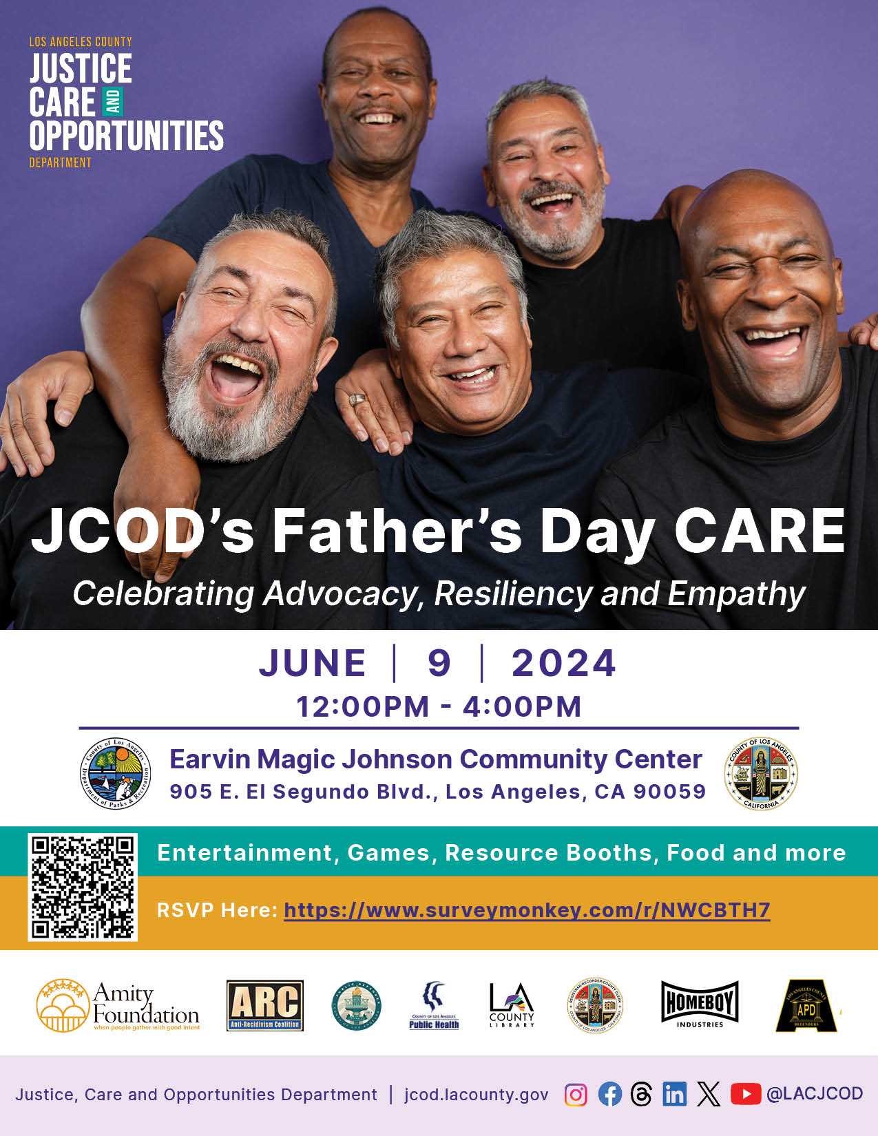 L.A. CADA is excited to participate in the Father's Day CARE: "Celebrating Advocacy, Resiliency, and Empathy" event on June 9, 2024, from 12:00 PM to 4:00 PM at the Earvin Magic Johnson Community Center. This family-friendly event will feature a variety of entertainment, engaging games, resource booths, delicious food, and more. It aims to honor the invaluable role of fathers in fostering advocacy, resiliency, and empathy within their families and communities. L.A. CADA will be there to offer support and resources, emphasizing the importance of strong, healthy family bonds in the journey towards recovery and well-being. Join us for an afternoon of celebration, connection, and community spirit.