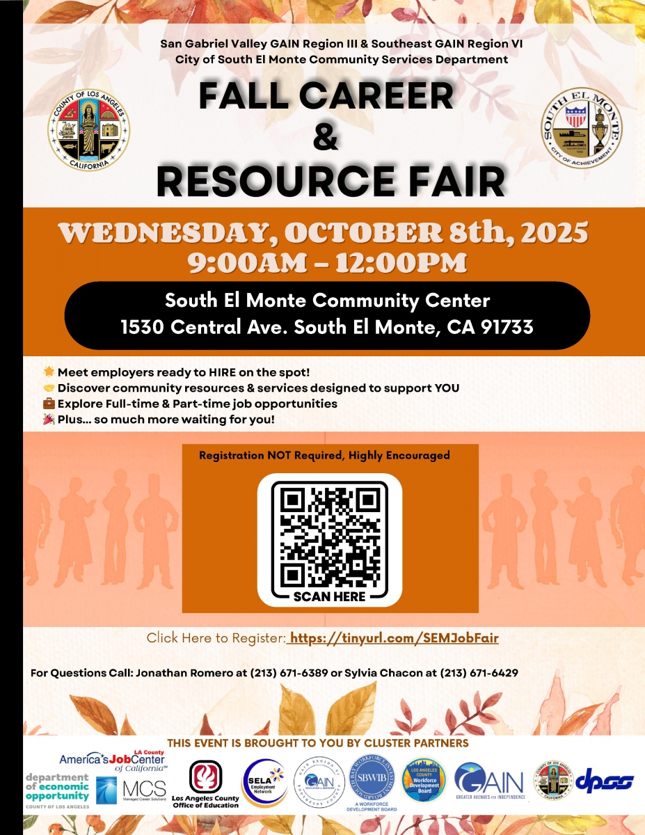 Expand your career horizons at the Fall Career & Resource Fair, hosted by the San Gabriel Valley and Southeast GAIN Regions and the City of South El Monte. This is an excellent opportunity for professional growth and community connection.
