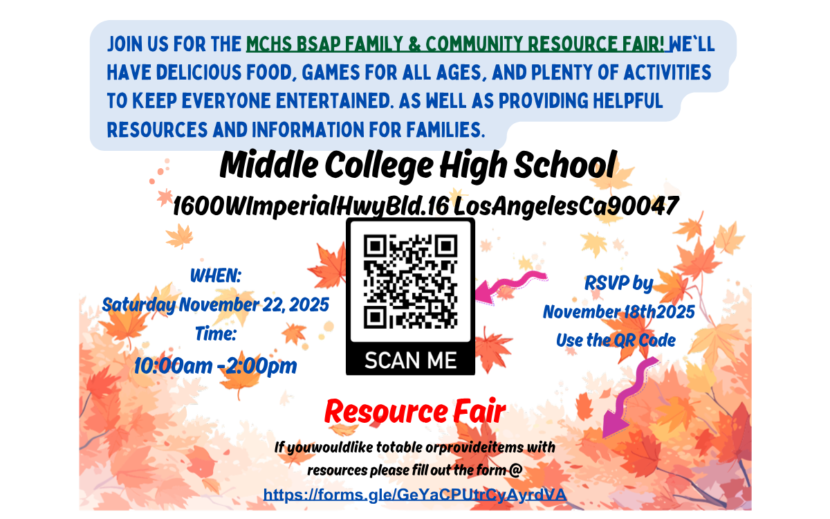 Join the Middle College High School (MCHS) BSAP Family & Community Resource Fair!