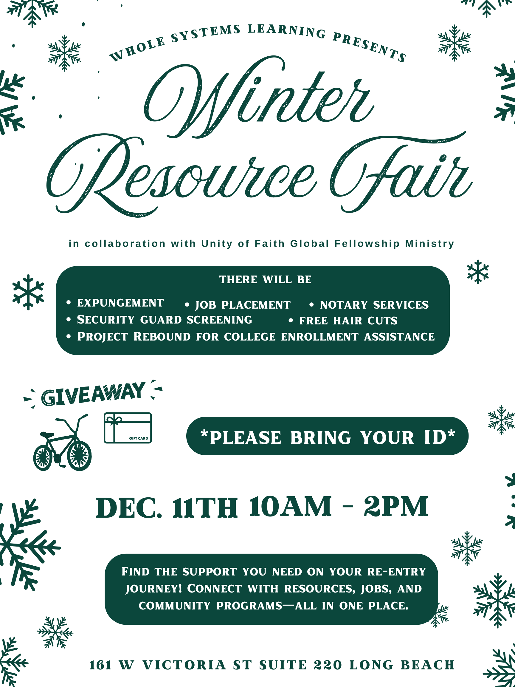 Details: This important Winter Resource Fair is being held in collaboration with Unity of Faith Global Fellowship Ministry. Attendees will find a variety of valuable services and opportunities, including support for expungement, job placement, and notary services. They will also be offering security guard screening, free hair cuts, and assistance through Project Rebound for college enrollment. Remember to bring your ID if you plan on attending.