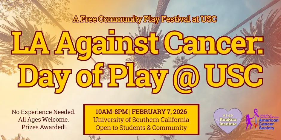 Event Details: We invite you to join the "LA Against Cancer: Day of Play," a free community festival hosted at USC. This unique event brings together students, advocates, and families for a full day of games, music, and creativity centered on finding solutions for cancer and its impact on our community. Attendees can enjoy interactive game demos, a chess tournament, live stage programming, and a special community and advocacy fair. It is a wonderful opportunity to connect with others and support cancer justice in an engaging, supportive environment.