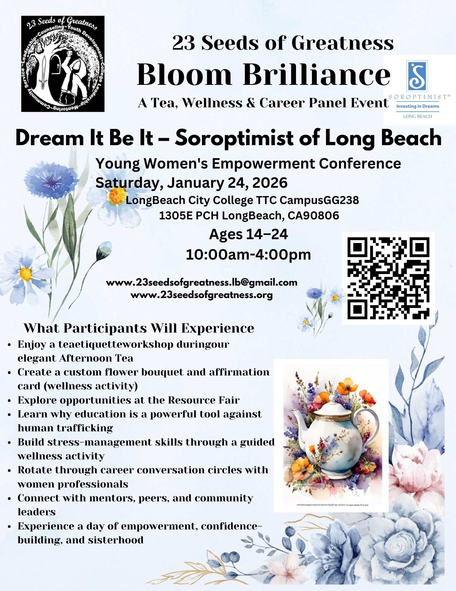 We are excited to highlight an inspiring upcoming event dedicated to the growth and wellness of young women in our community. On Saturday, January 24, 2026, "23 Seeds of Greatness" and Soroptimist International of Long Beach are hosting Bloom Brilliance: A Tea, Wellness & Career Panel Event. This empowerment conference is specifically designed for young women ages 14 to 24 and aims to build confidence through mentorship and self-care.