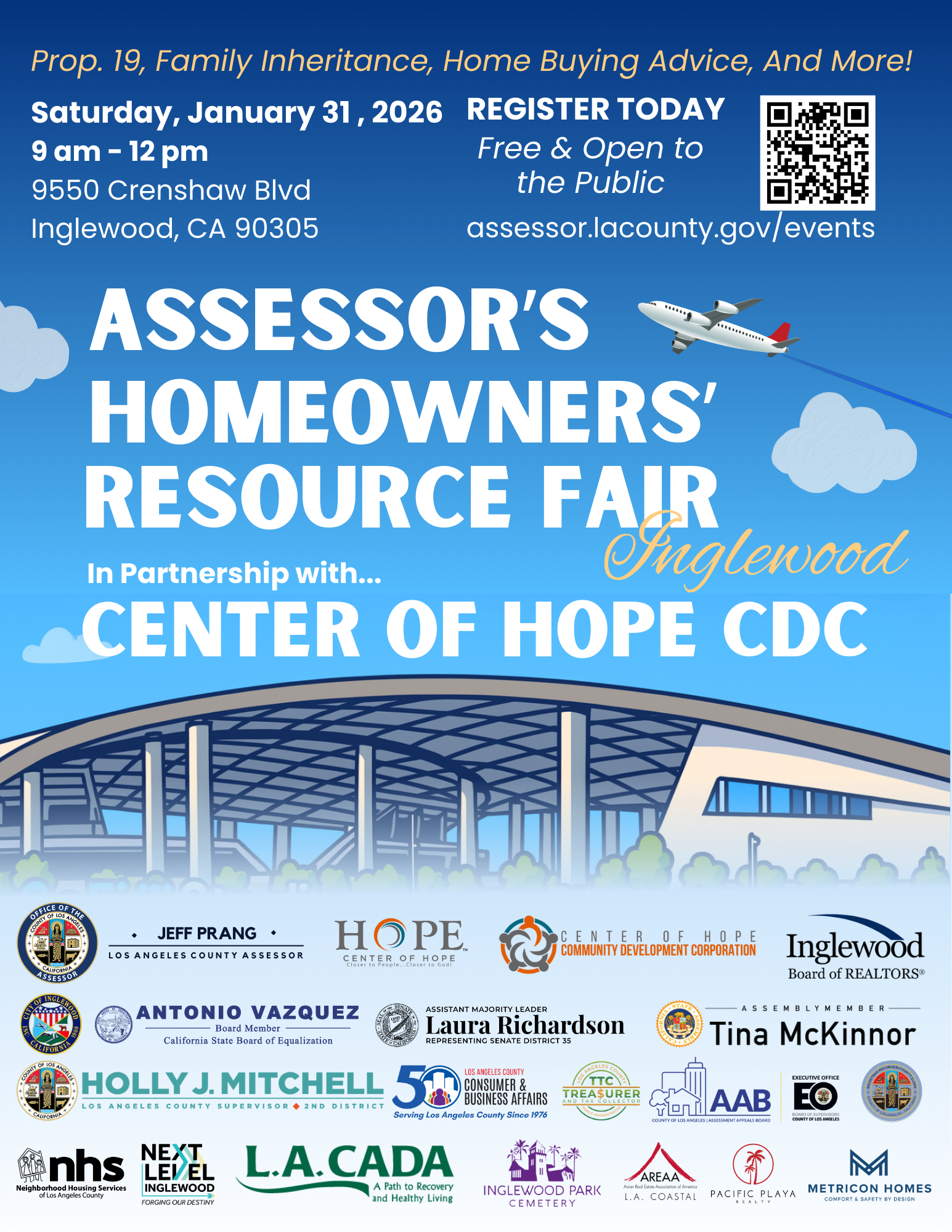Event Description: Join Los Angeles County Assessor Jeff Prang, in partnership with the Center of Hope CDC and the Inglewood Board of Realtors, for a free community resource fair. This one-stop event is designed to help local residents access valuable information and resources regarding homeownership and property taxes.