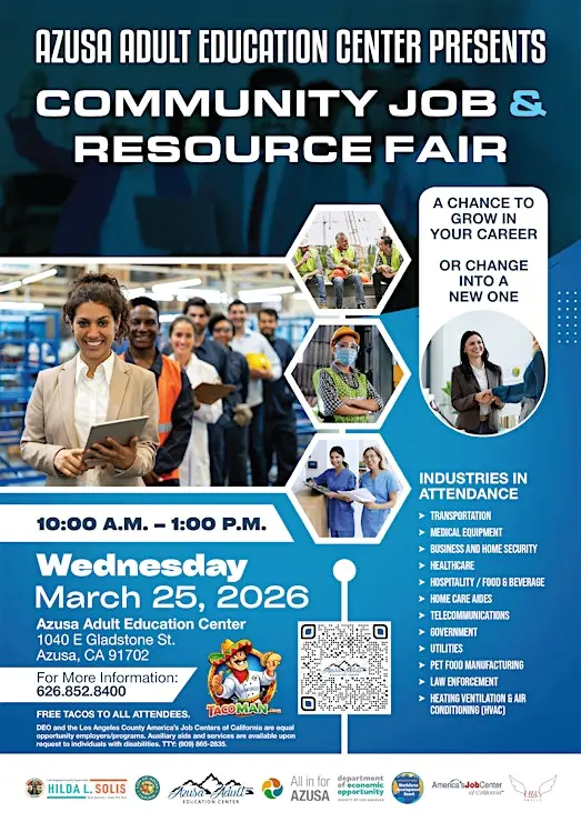 Join us for a dynamic and opportunity-filled Community Job & Resource Fair hosted by Azusa Adult Education Center. This event is designed to connect job seekers, career changers, students, and community members with local employers and valuable community resources.