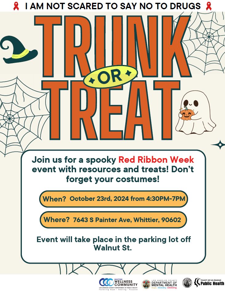 The Greater Whittier LGBTQ Center operated by L.A. CADA will be participating in the WWC Trunk or Treat 2024, a fun and spooky event in support of Red Ribbon Week! Join us on October 23rd, 2024, from 4:30 PM to 7:00 PM at 7643 S Painter Ave, Whittier, CA 90602 for an evening filled with costumes, resources, and treats!